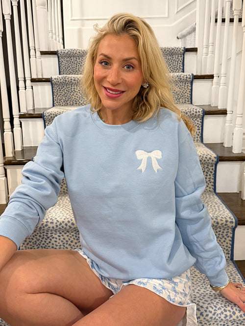 So demure, so cutesy—the White Bow Embroidered Baby Blue Sweatshirt...